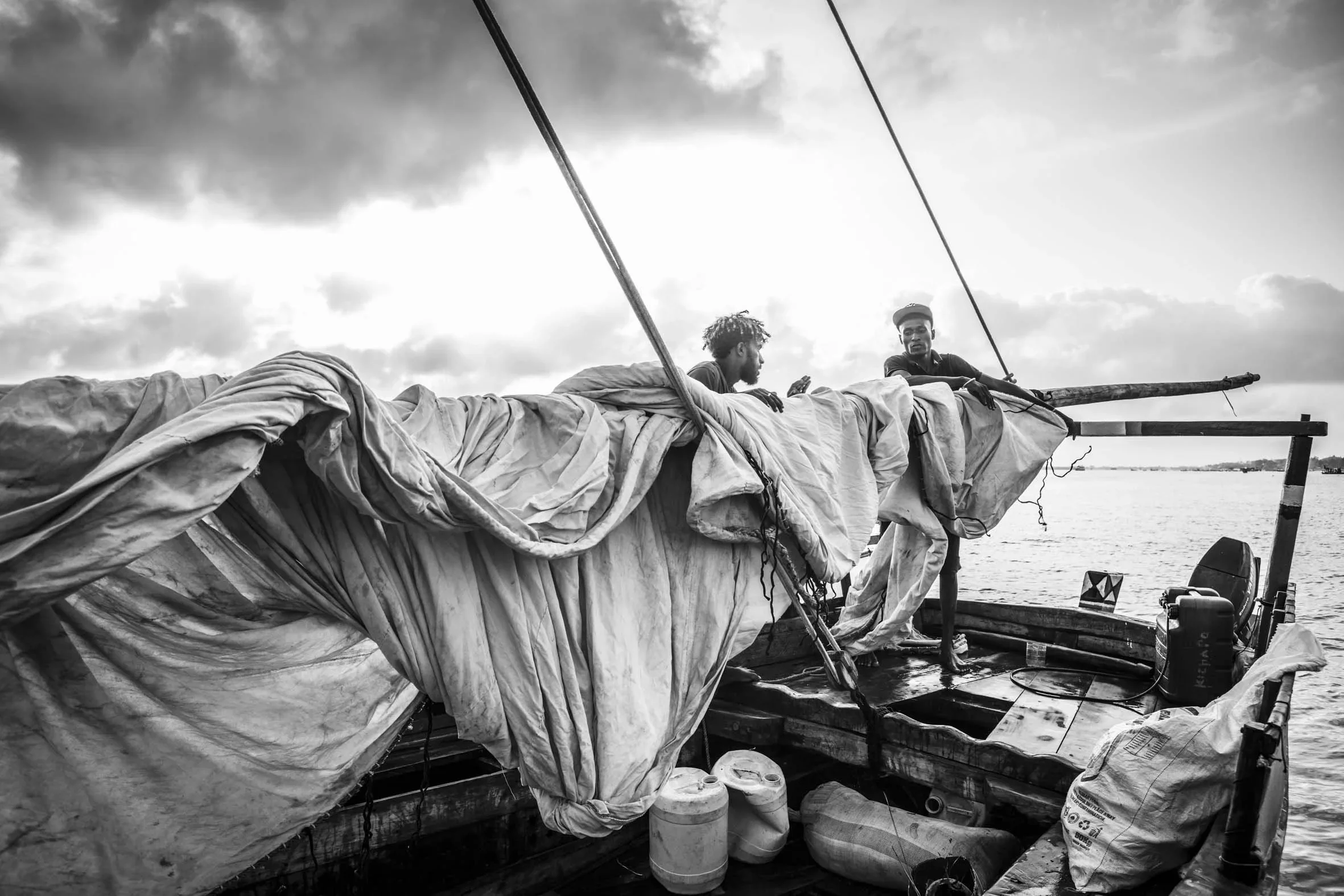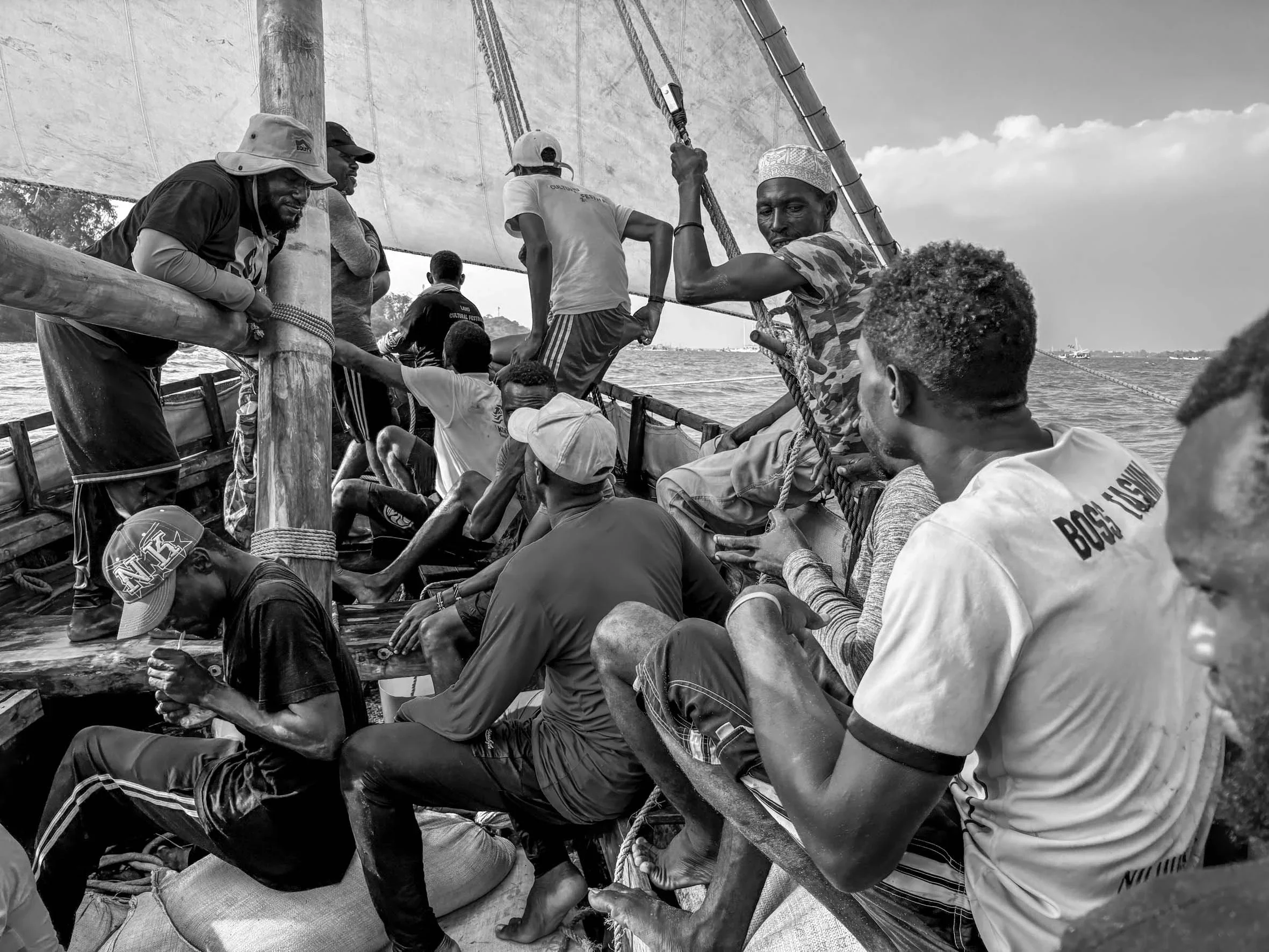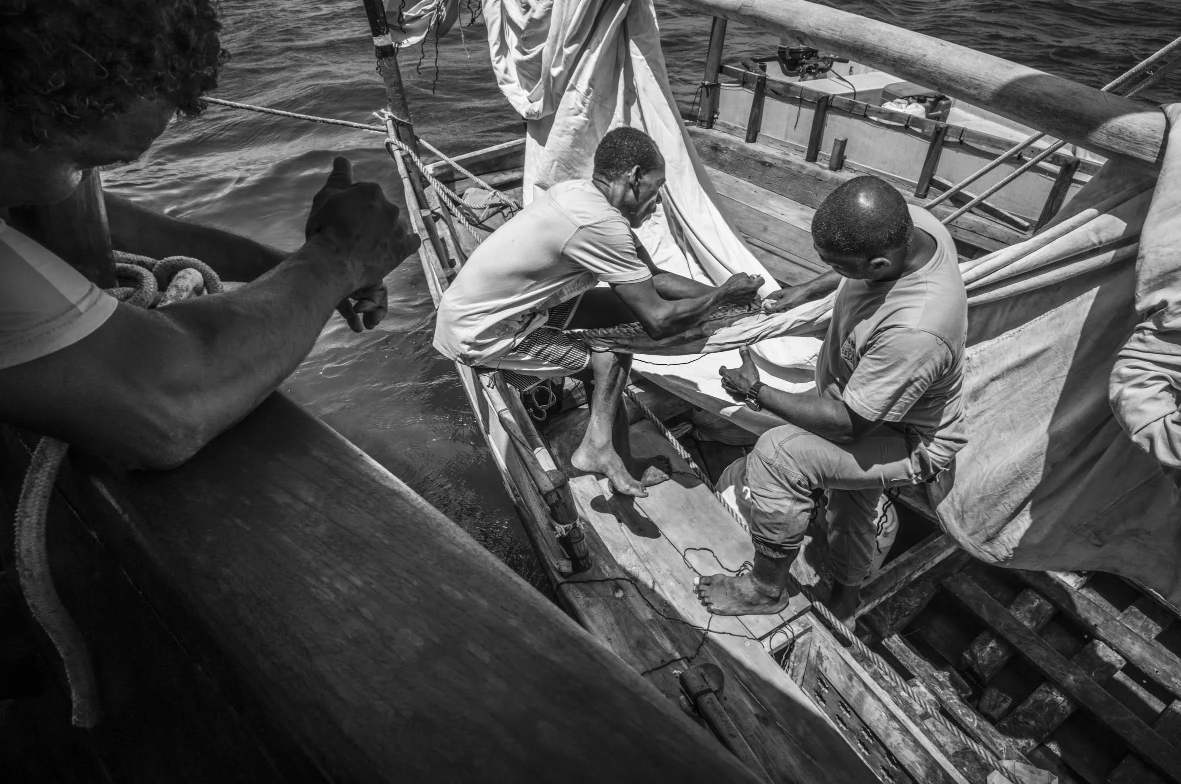 The dhows have no electrical power on board. No pumps, no winches, no instruments. Sheeting in the vast single sail is done by many hands working in unison. They often sail with the highly respected “Fundi” amongst the crew, the shipwright who designed built the boat. His reputation can be made or lost, depending on the performance of the boat.